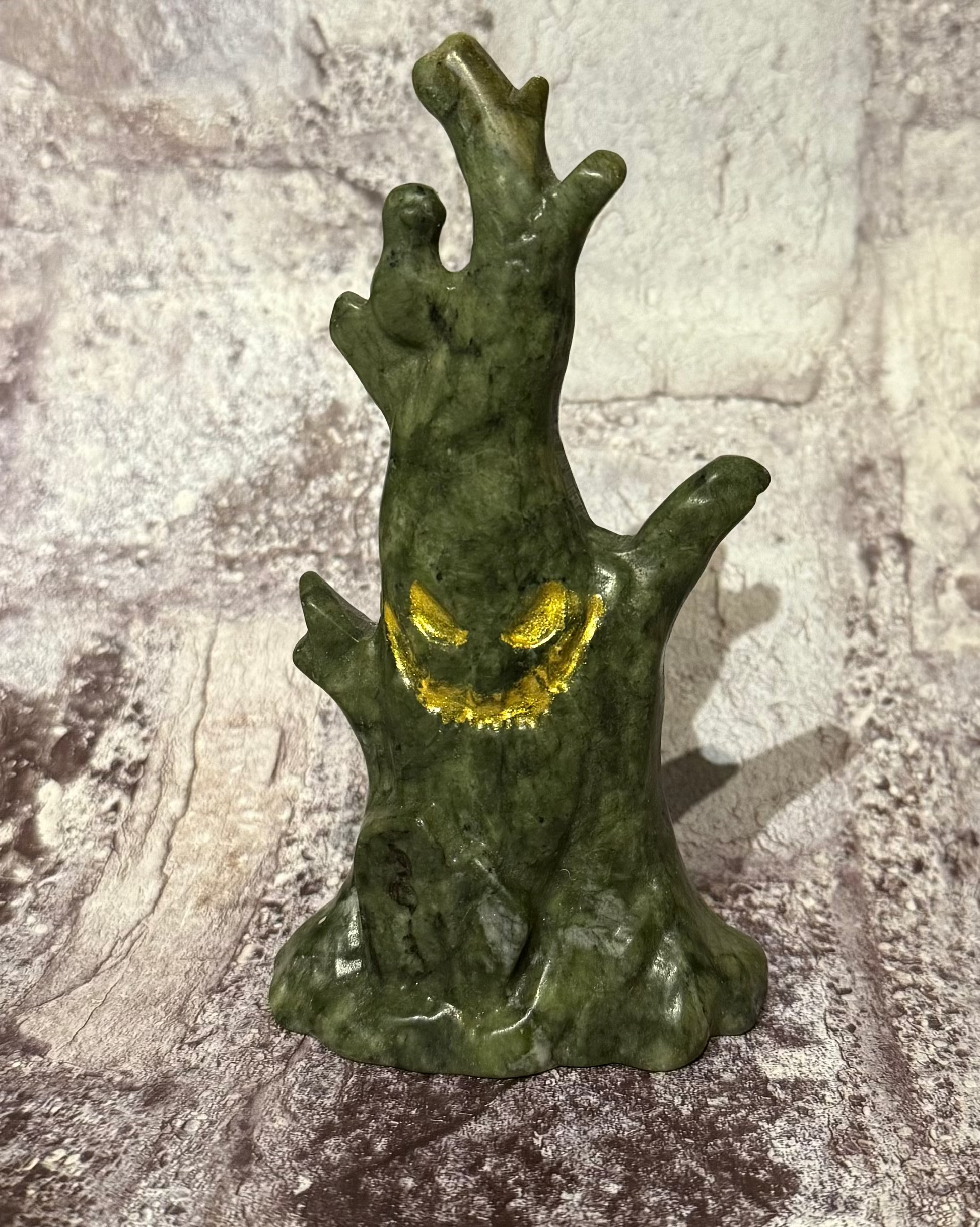 This one-of-a-kind spooky tree carving is carved from natural green nephrite jade, featuring twisting branches that cradle a perched bird and a tombstone at the base for extra haunted vibes. A gold-painted face peers out from the trunk, giving this piece a playful yet eerie personality that is perfect for Halloween altars or year-round gothic décor.